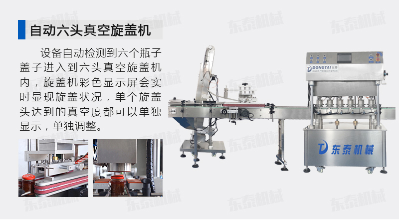 該直線式真空旋蓋機(jī)是東泰機(jī)械結(jié)合用戶使用的情況,摒棄了傳統(tǒng)轉(zhuǎn)盤式真空旋蓋機(jī)的弊端,研制開發(fā)的設(shè)備,設(shè)備自動檢測到六個(gè)瓶子蓋子進(jìn)入到六頭真空旋蓋機(jī)內(nèi),旋蓋機(jī)彩色顯示屏?xí)䦟?shí)時(shí)顯現(xiàn)旋蓋狀況,整機(jī)多點(diǎn)檢測,當(dāng)進(jìn)口無瓶無蓋、出口堵塞、定位不準(zhǔn)、瓶身傾倒均自動停機(jī)。單個(gè)旋蓋頭達(dá)到的真空度都可以單獨(dú)顯示,單獨(dú)調(diào)整!