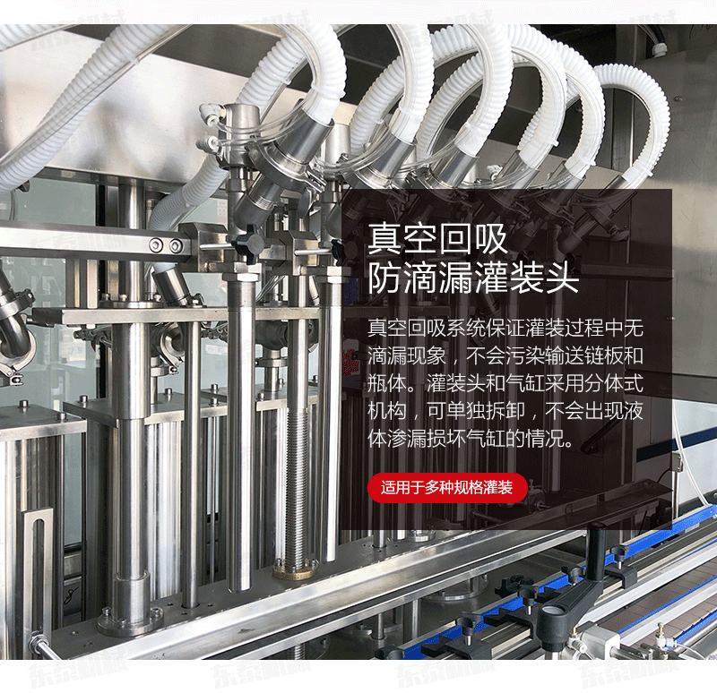 1.真空回吸系統(tǒng)保證灌裝過(guò)程中無(wú)滴漏現(xiàn)象,不會(huì)污染輸送鏈板和瓶體。灌裝頭和氣缸采用分體式機(jī)構(gòu),可單獨(dú)拆卸,不會(huì)出現(xiàn)液體滲漏損壞氣缸的情況。進(jìn)口亞德客氣缸經(jīng)久耐用,其他密封等配件使用標(biāo)準(zhǔn)件,更換維護(hù)簡(jiǎn)單方便。