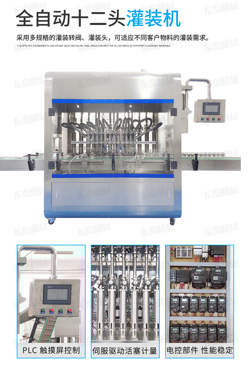 2、灌裝機(jī)以進(jìn)口PLC電腦控制、伺服驅(qū)動(dòng)計(jì)量,全彩色觸摸屏人機(jī)界面,一鍵完成計(jì)量切換確保容量之調(diào)整簡易、快捷、準(zhǔn)確。是任何形式的灌裝機(jī)無法替代的;