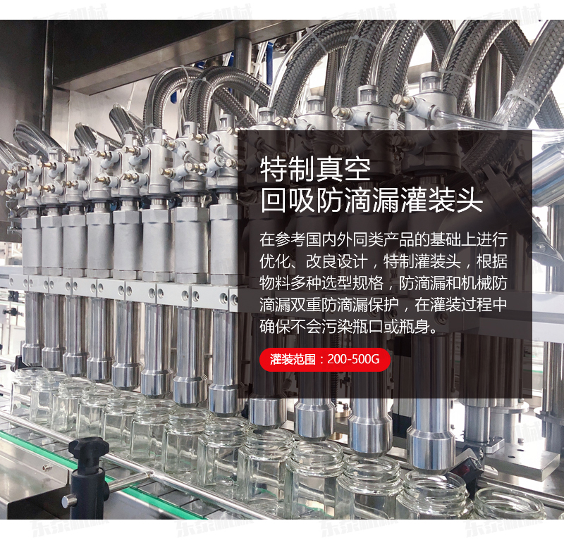 3、灌裝機(jī)采用橫推料的方式,大大縮短了下料斗到灌裝頭的距離,提高了灌裝速度,更重要的是解決了含油量大的物料在灌裝過程中出現(xiàn)的有些瓶油多,有些瓶醬多的灌裝難題,大大提高了灌裝精度。