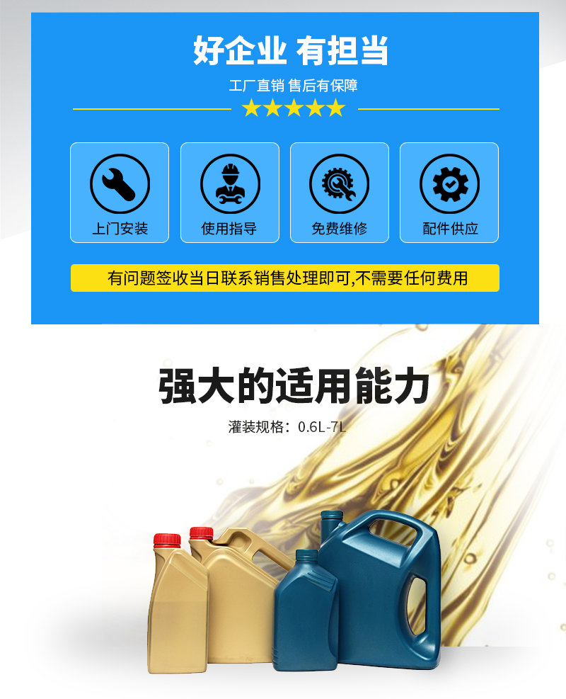 機器應(yīng)用范圍:1-10升通用型號,機器采用流量計計量,觸摸屏控制,參數(shù)一鍵調(diào)整,方便快捷?梢怨嘌b各種油脂,油料。灌裝頭采用專用的油脂防滴漏灌裝頭,不滴漏。機器設(shè)定有快慢速技術(shù),可以先快后慢,防止物料噴濺。保持生產(chǎn)車間干凈潔凈。