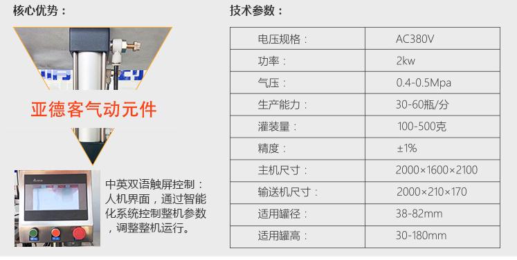 灌裝機(jī)采用活塞式灌裝原理,適用于調(diào)味品中帶顆粒并且濃度較大的辣椒醬、豆瓣醬、花生醬、香菇醬、果醬、牛油火鍋底料、紅油火鍋底料、蝦醬等較為粘稠醬類的灌裝。