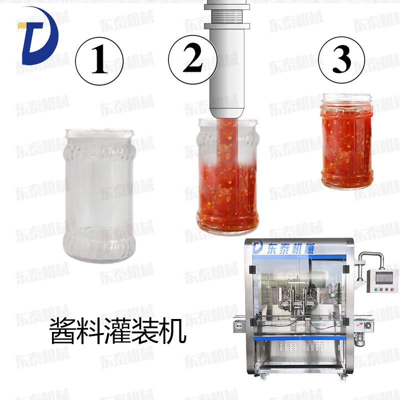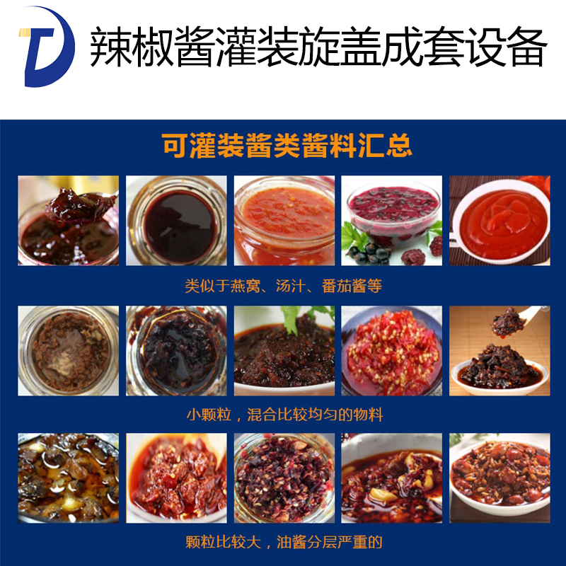 辣椒醬灌裝機(jī)采用活塞式灌裝原理,適用于調(diào)味品中帶顆粒并且濃度較大的辣椒醬、豆瓣醬、花生醬、香菇醬、果醬、牛油火鍋底料、紅油火鍋底料、蝦醬等較為粘稠醬類(lèi)的灌裝。